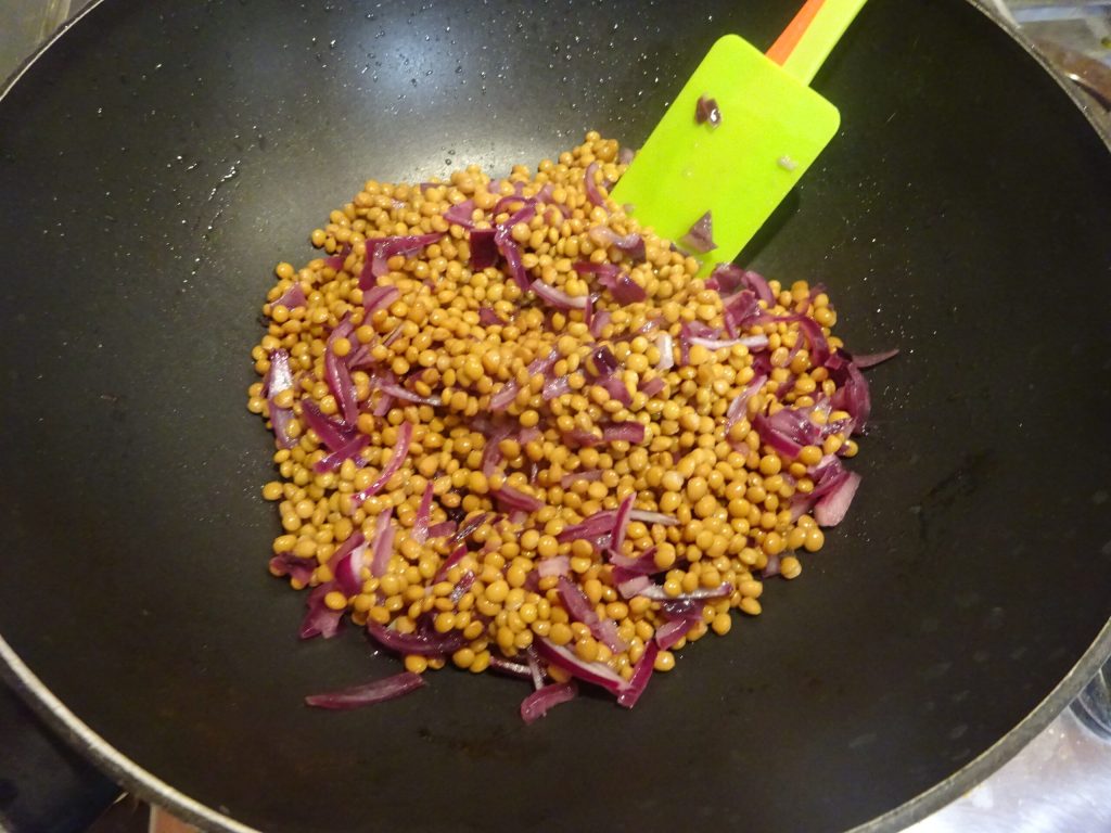 Voeg vervolgens de goed uitgelekte linzen toe en laat ongeveer 5 minuten op smaak komen, nog steeds met deksel en op middellaag vuur.
