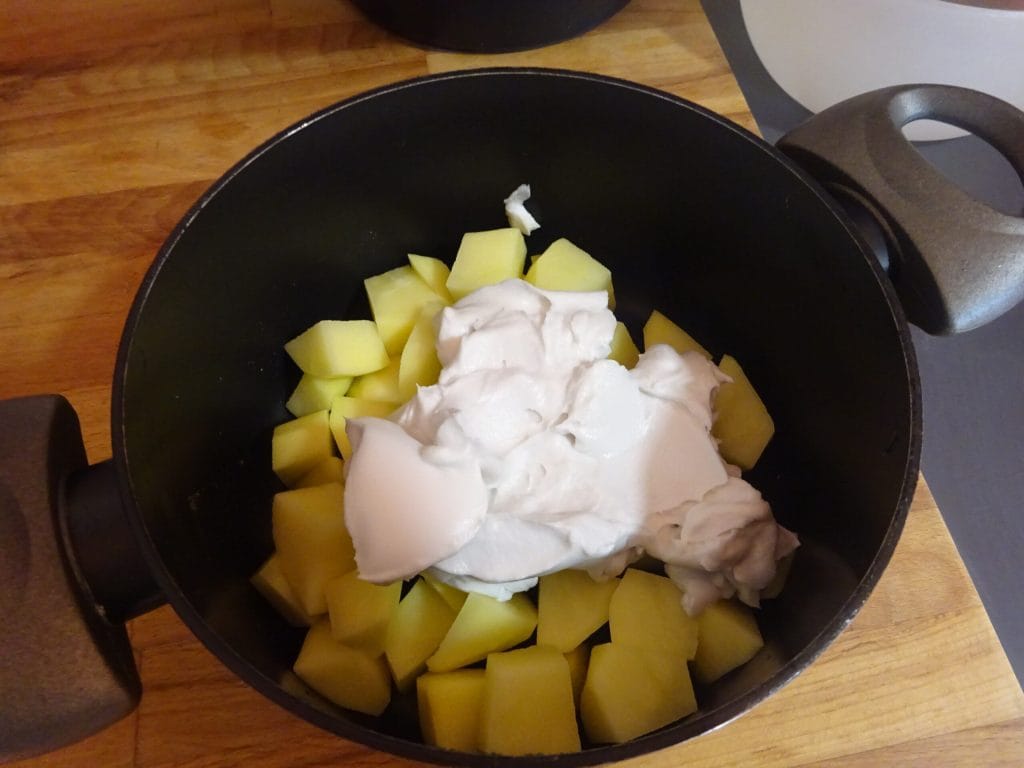 Zodra de aardappelen gesneden zijn, doe ze in een pan en voeg de kokosroom toe.