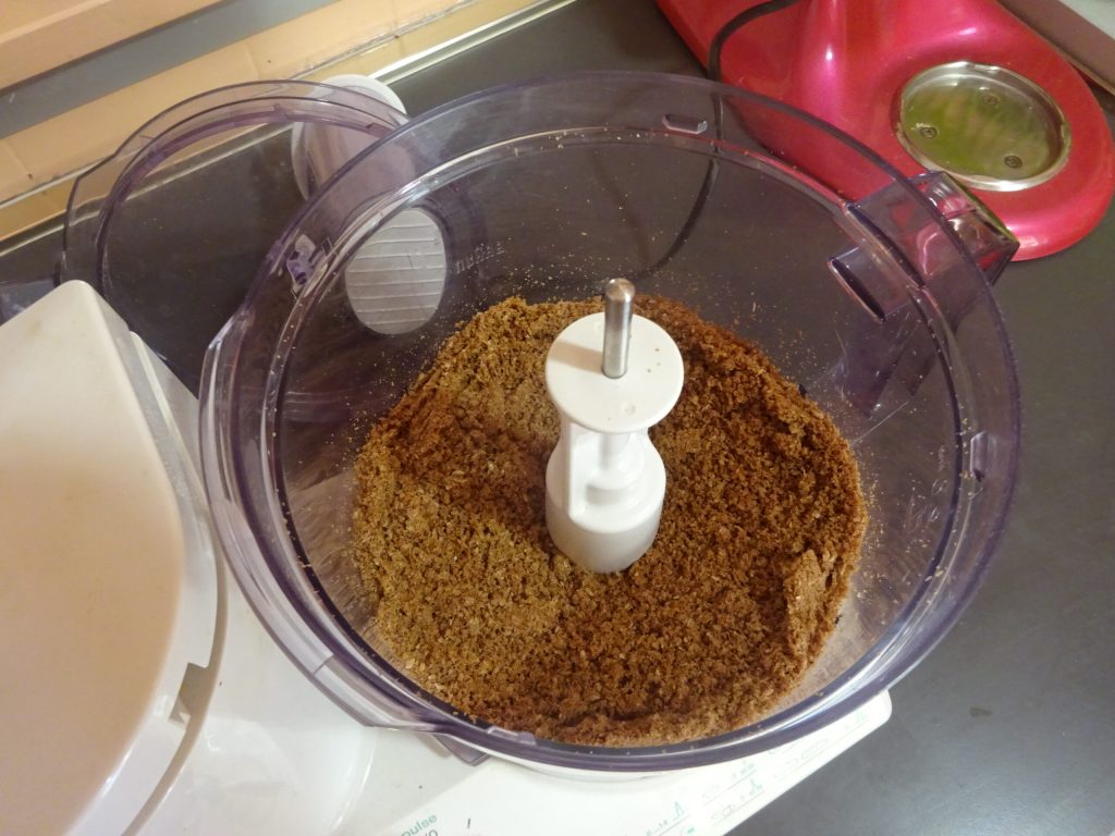 Doe het briochebrood (taart of koekjes) in een keukenrobot en mix tot een poeder.