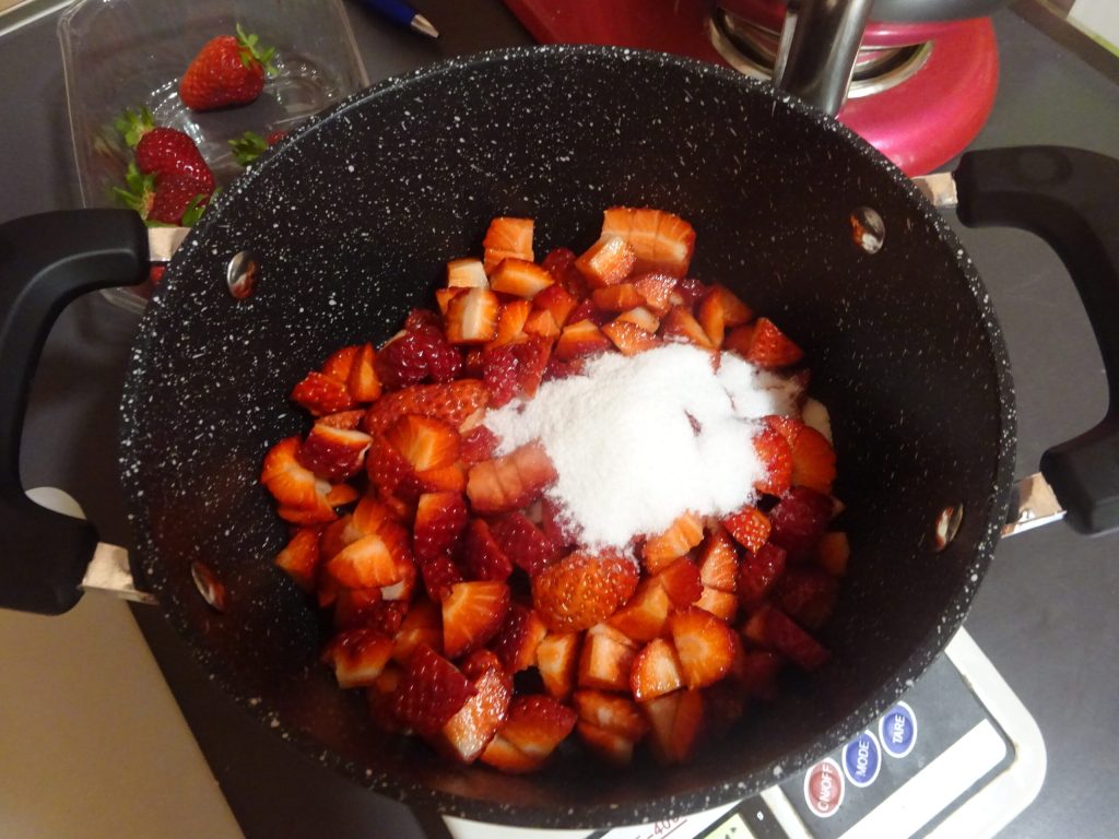 Voor de compote, maak de aardbeien schoon, was ze goed en snijd ze in stukjes. Doe ze in een pan met de suiker.
