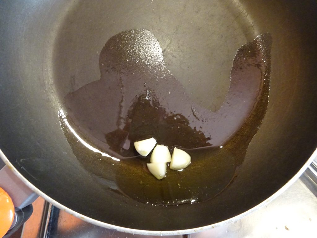 Giet in een grote pan 2 eetlepels olijfolie en voeg de doormidden gesneden knoflookteentjes toe, zet op laag vuur en bak gedurende een paar minuten aan.