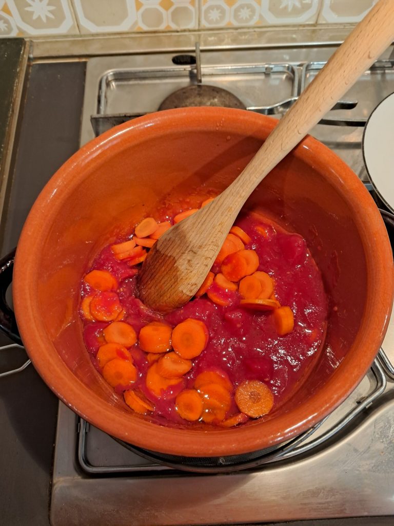 Voeg de wortelschijfjes en de tomatenpuree toe, roer en laat 10 minuten op middelhoog vuur met deksel koken.