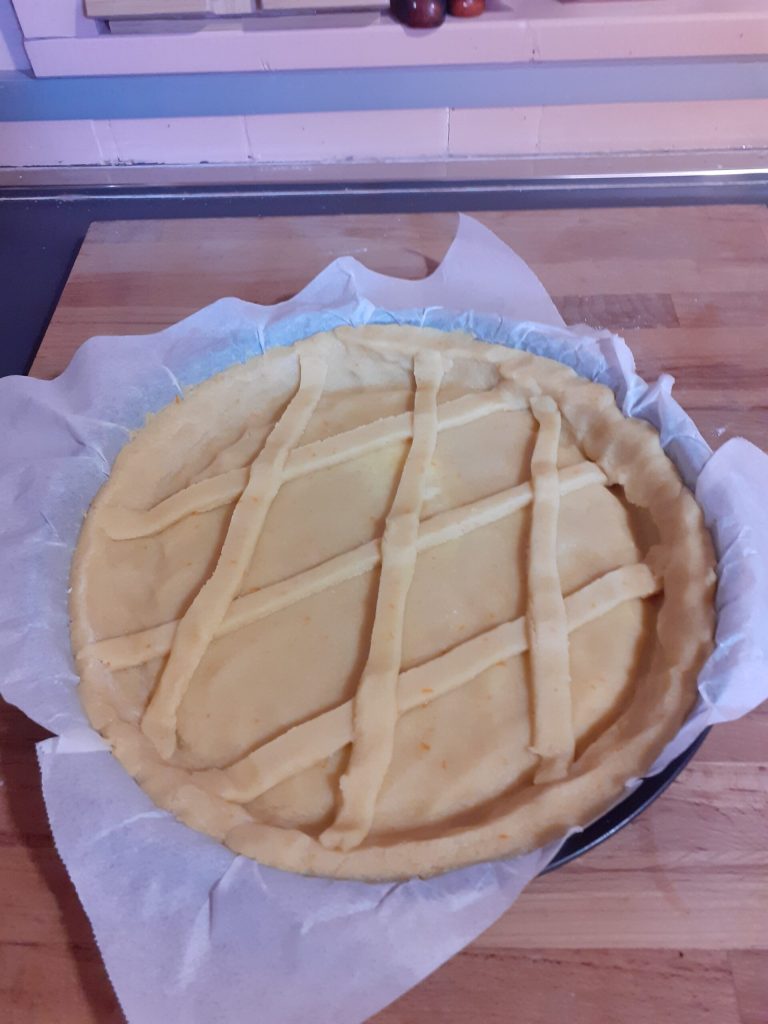 • Na de 30 minuten rust van de zanddeeg, haal het uit de koelkast en leg het tussen twee licht met bloem bestoven bakpapieren. Rol het uit met een deegroller tot een dikte van ongeveer een halve centimeter. (Als je siliconen ringen hebt, nog beter, het zal mooi gelijkmatig zijn.)