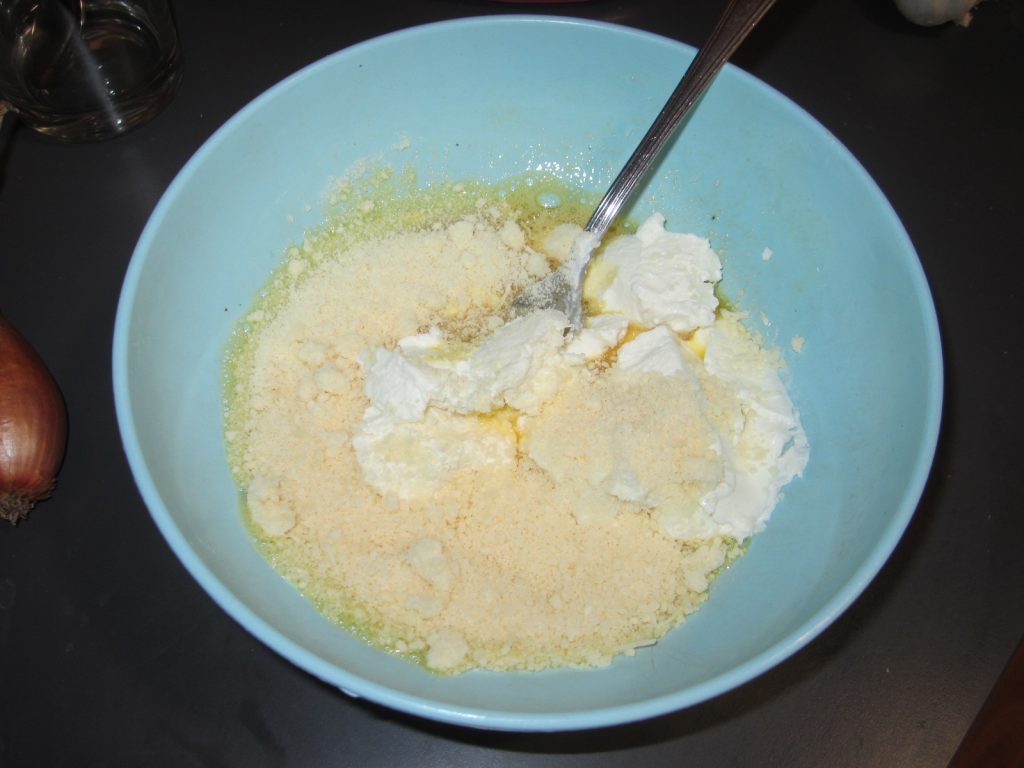 Meng ondertussen in een kom de ricotta, geraspte Grana en 10 g gesmolten boter in de magnetron.