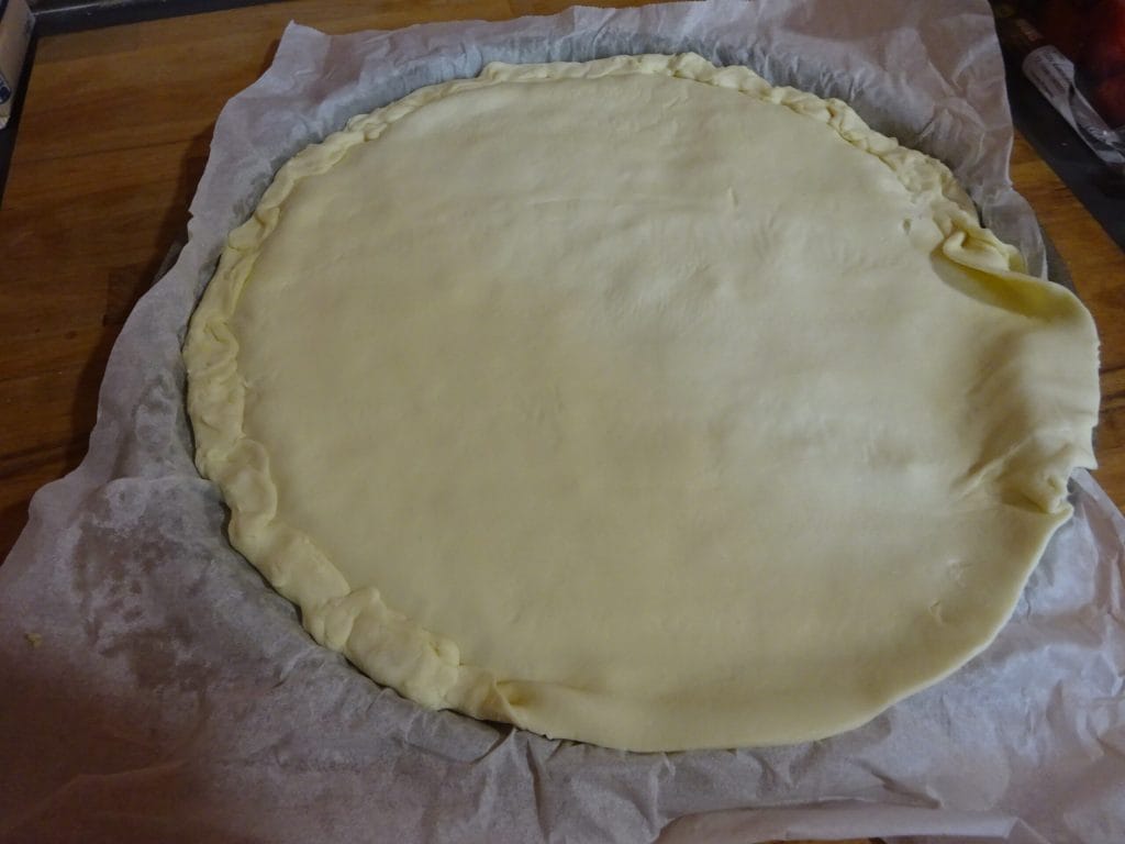 Dek af met de andere rol deeg en zorg ervoor dat de randen goed sluiten. Sluit de randen goed af om te voorkomen dat de vulling eruit loopt.