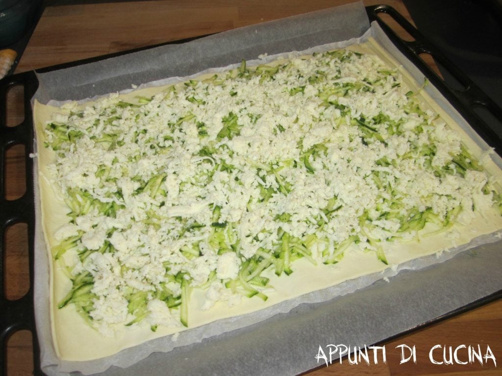Bedek het bladerdeeg eerst met de geraspte courgettes en daarna met de mozzarella.