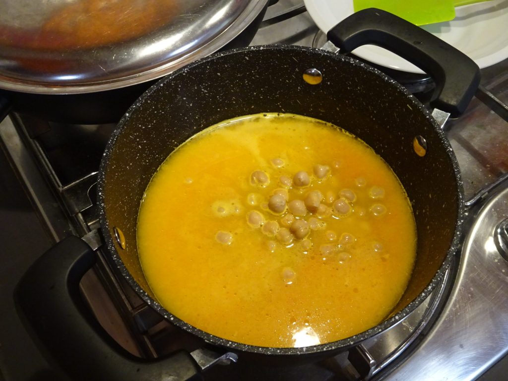Zet het weer op het vuur en voeg de gekookte kikkererwten toe, verwarm een paar minuten en mix dan lichtjes zodat ongeveer de helft van de kikkererwten heel blijft.