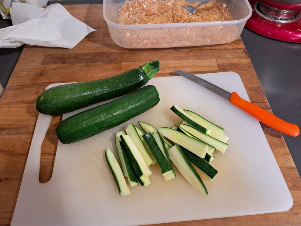 • Was en snijd de courgettes en snijd ze dan in reepjes.