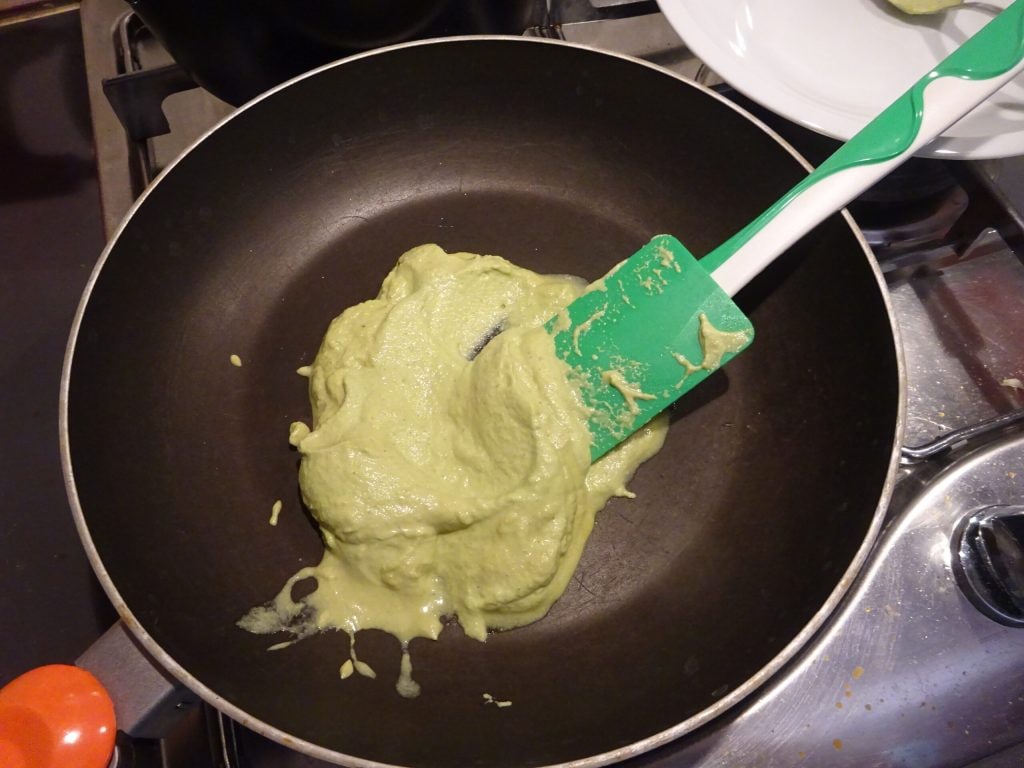 • Wanneer de pasta bijna gaar is, doe je de COURGETTE PESTO in een grote koekenpan met een eetlepel olijfolie en verwarm het een paar minuten.