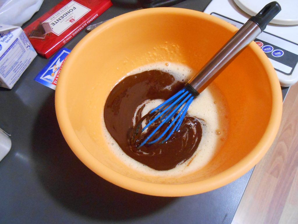 Voeg vervolgens de gesmolten chocolade toe en roer tot alles goed gemengd is.