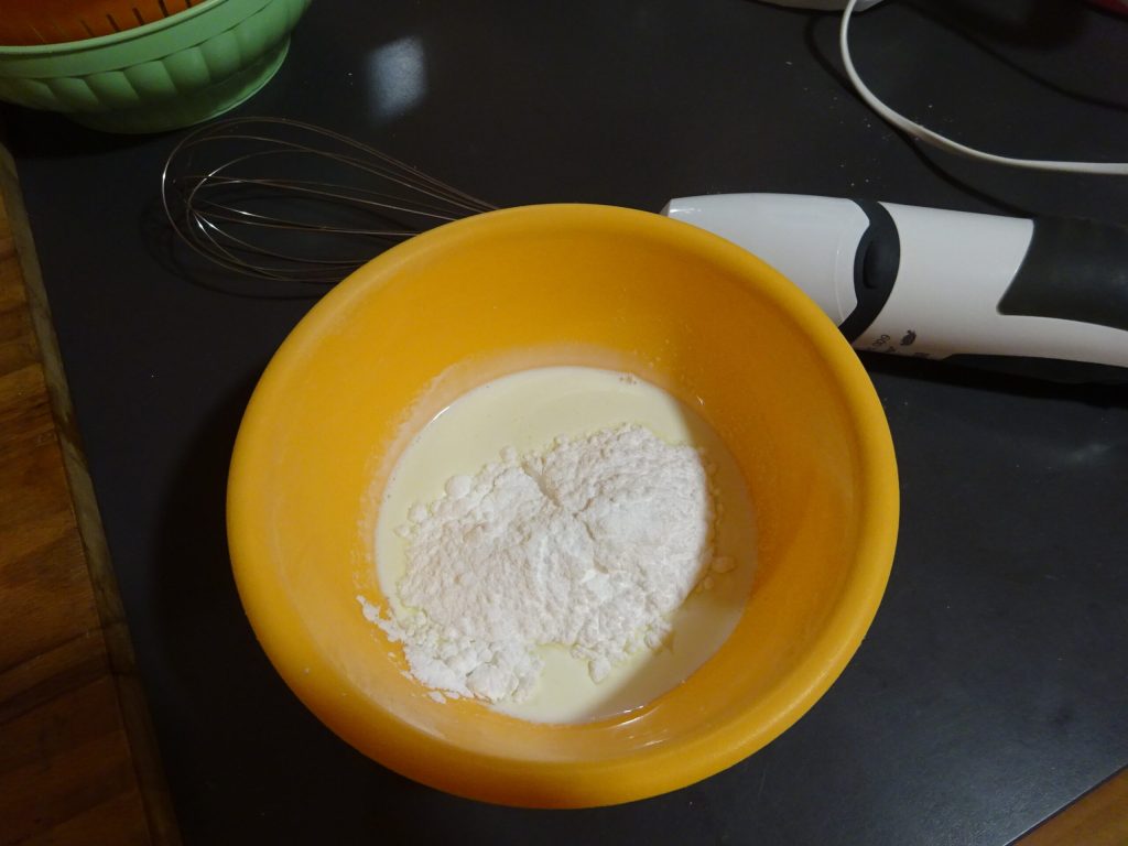 Voor de vulling, verdeel de slagroom in twee gelijke delen, één deel klop je op met de poedersuiker en het andere deel verwarm je in een pannetje zonder het te laten koken.