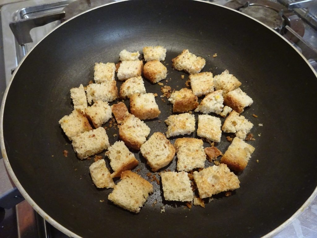 Als je wilt, kun je bij het roosteren van de croutons een snufje knoflookpoeder toevoegen, maar niet te veel, anders overheerst het de andere smaken.