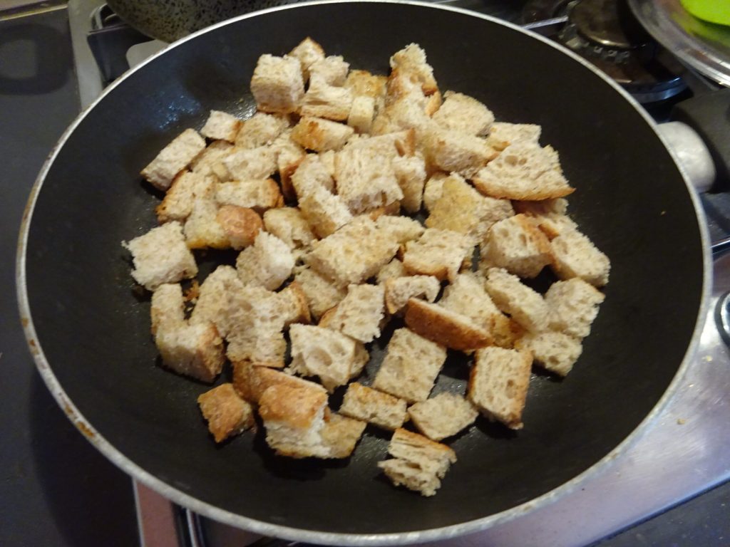 Snijd ondertussen het brood in blokjes