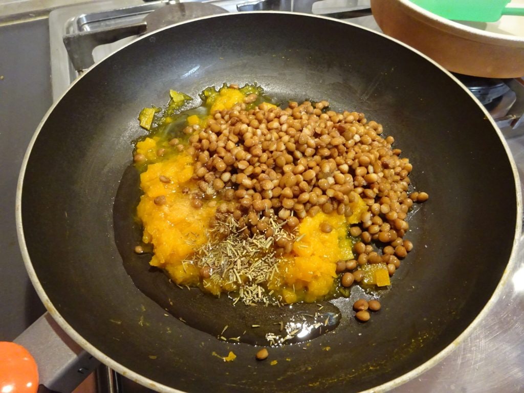 Verhit eerst het water om de pasta te koken, zodra het kookt, voeg zout toe en doe de pasta erin. Haal de pasta een paar minuten voor het einde van de kooktijd eruit, want deze moet verder koken met de pompoen- en linzensauss.