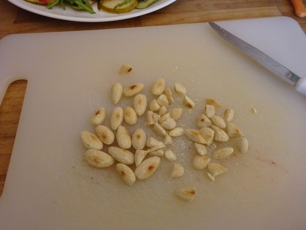 • Hak de geroosterde amandelen grof, sommige kunt u eventueel ook heel laten.