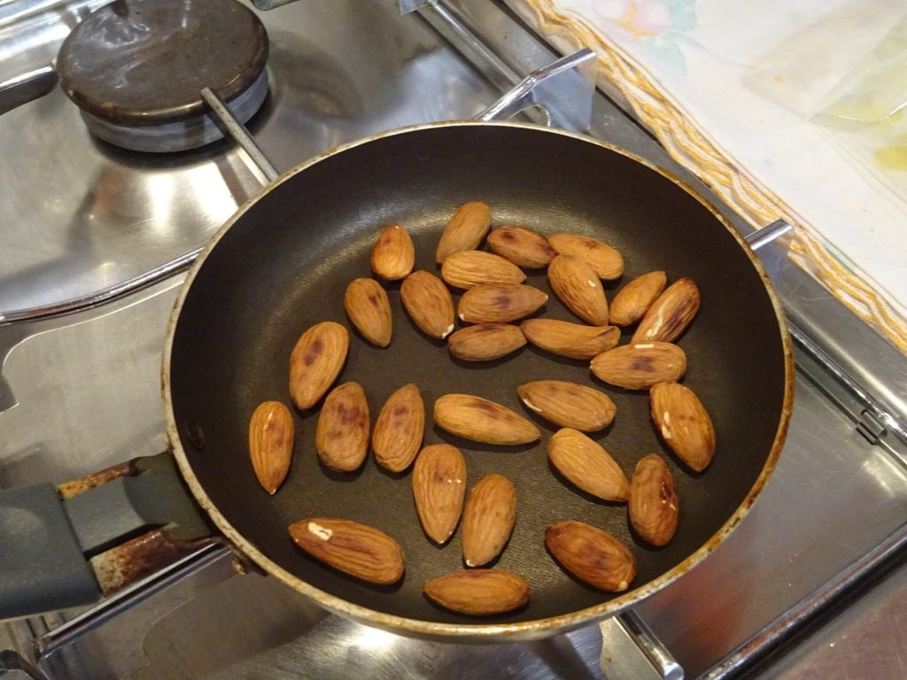 In de tussentijd, doe de ongepelde amandelen in een klein pannetje en rooster ze lichtjes op matig vuur voor een paar minuten.