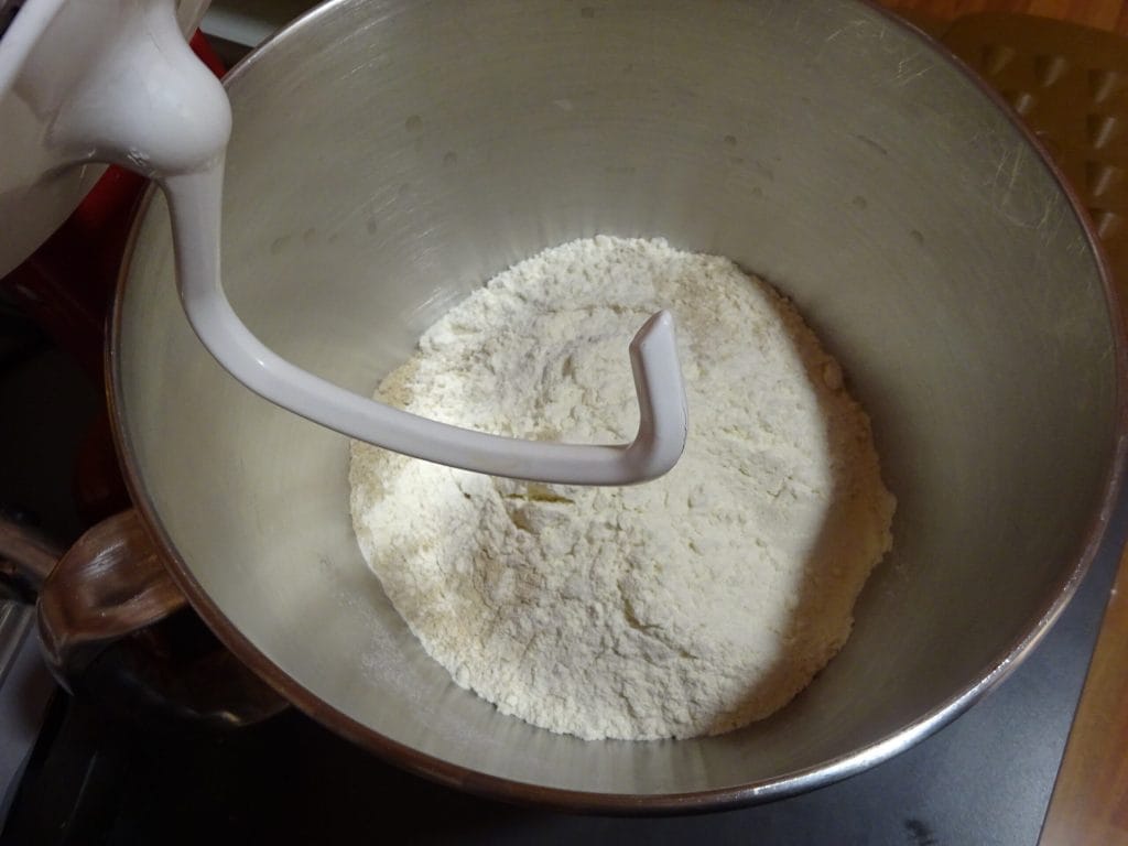 Doe de bloem 0 en de Manitoba bloem in de kom van de keukenmachine. Voeg de gedroogde zuurdesem toe en start de keukenmachine.