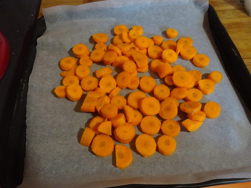 Was en reinig de wortelen, snijd ze vervolgens in plakjes van ongeveer een halve centimeter dik en leg ze op een bakplaat bekleed met bakpapier.