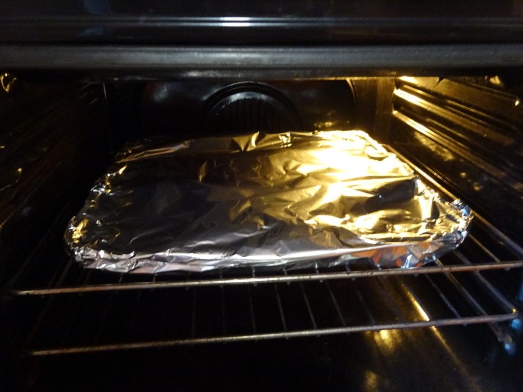 Dek de bakplaat af met aluminiumfolie en bak in een voorverwarmde oven op 180°C gedurende 15 minuten.