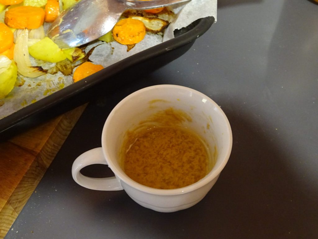 Haal de bakplaat uit de oven wanneer de groenten gaar zijn en breng op smaak met de mosterdsaus.