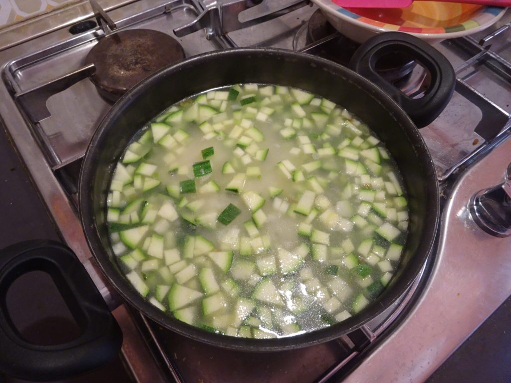 • Na de 10 minuten kooktijd voeg je de tweede courgette toe, welke aan het einde van de kooktijd licht krokant zal zijn, en 100 ml bouillon.