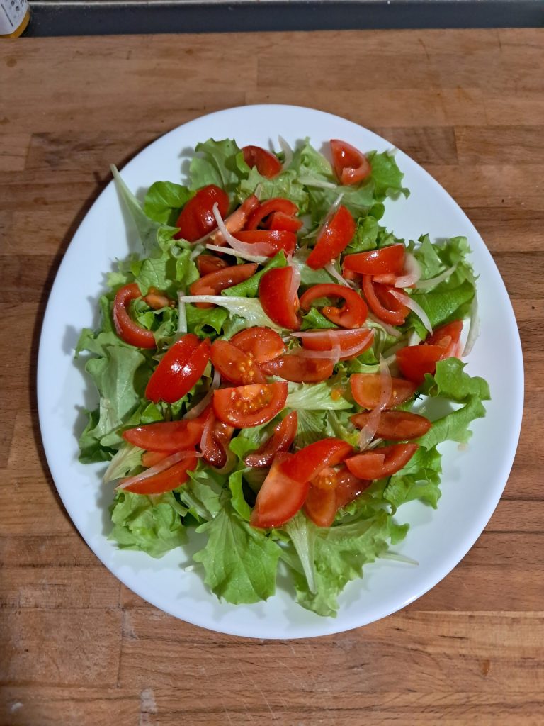 Neem de borden waarop je de salade wilt serveren, maak een bedje van lamsla en voeg vervolgens de tomaten met de ui toe.