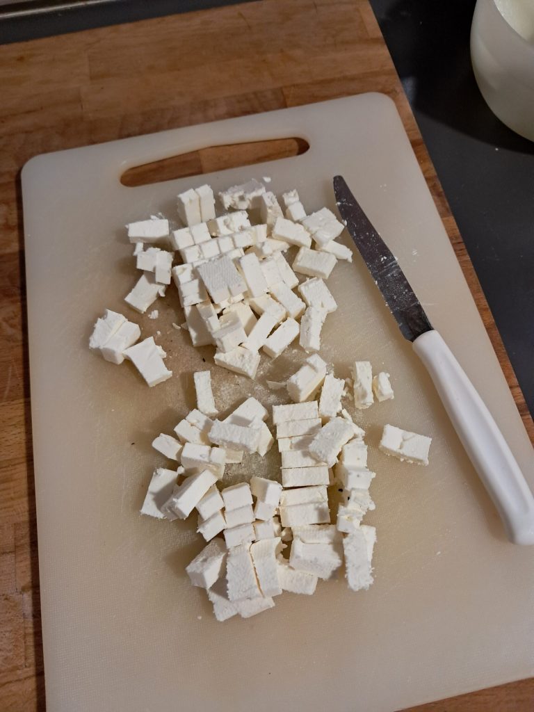 • Snijd nu de feta in blokjes van niet meer dan 1 cm.