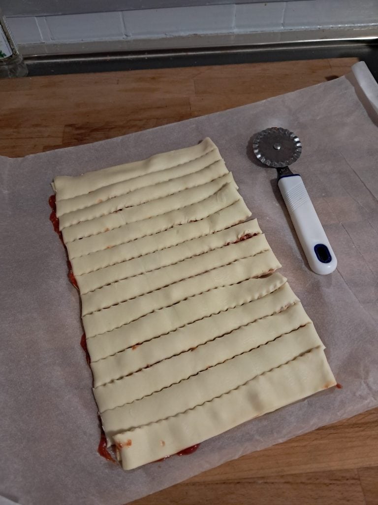 Vouw vervolgens het bladerdeeg dubbel en snijd met een getand wiel stroken van ongeveer 1 centimeter breed, die dan de broodstengels zullen zijn. Meestal haal ik er 14 uit.