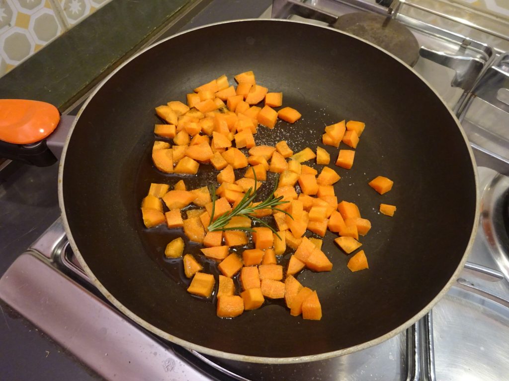 • Giet de olijfolie en de wortelblokjes in een koekenpan. Voeg een takje rozemarijn en een snufje knoflookpoeder toe.