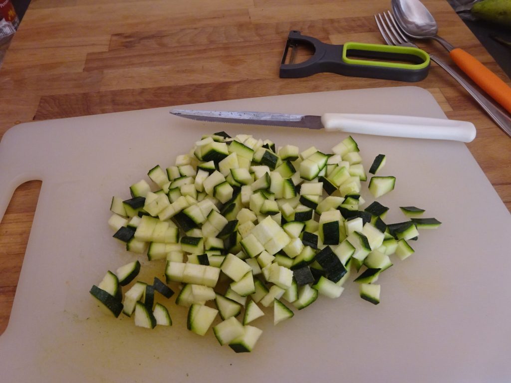 • Maak ook de courgette schoon en snijd deze in blokjes.