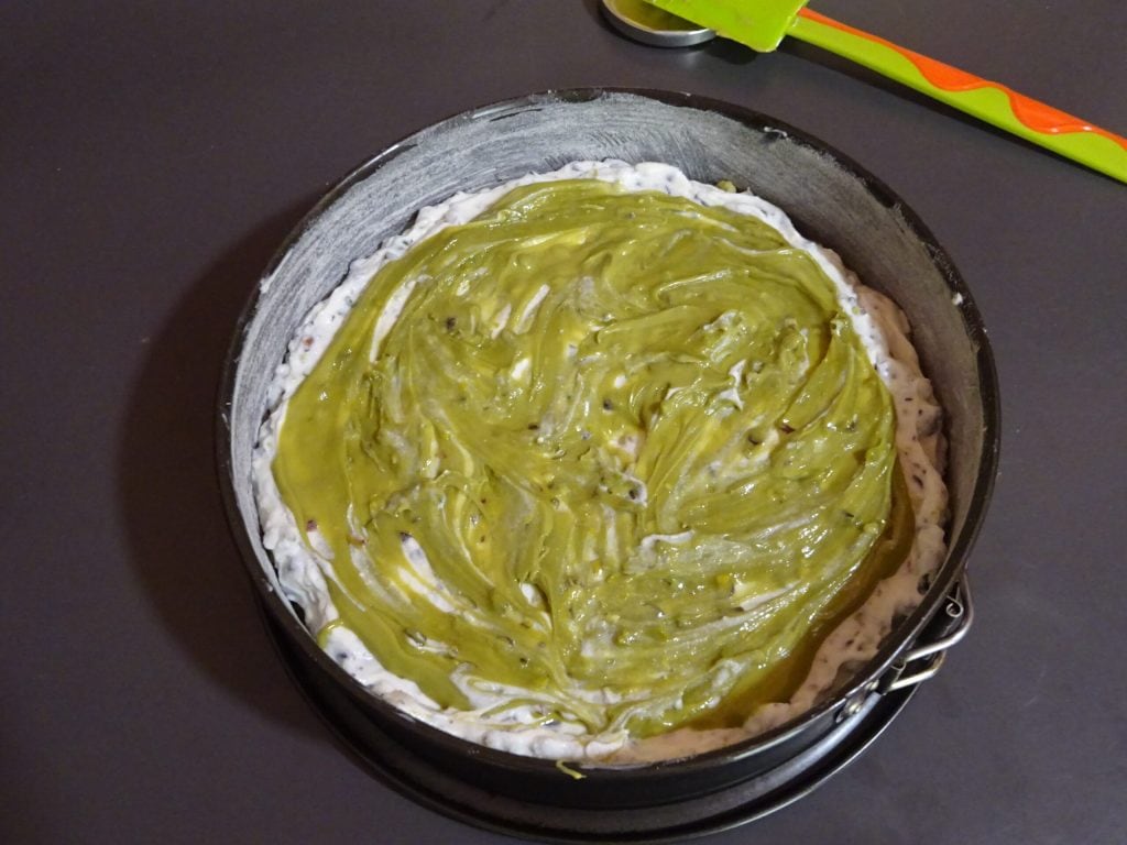 Leg de helft van de kruimels op de bodem. Giet de ricottacrème en smeer tot slot de pistachecrème uit.