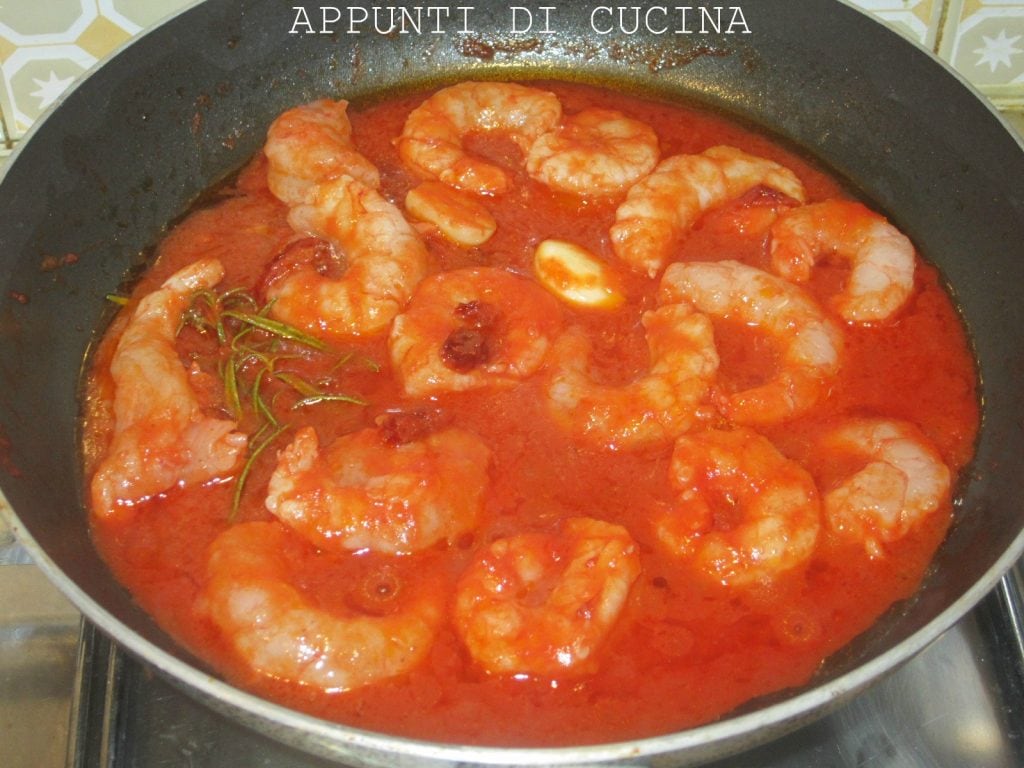 Snijd de gedroogde tomaten fijn en voeg ze na tien minuten toe aan de tomatenpassata samen met de schoongemaakte en gedroogde garnalenstaarten.