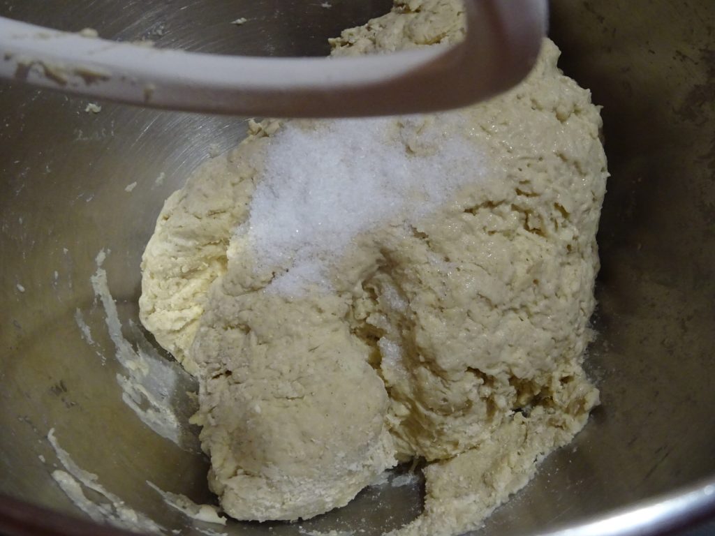 Stop nu de keukenrobot, voeg het zout en het resterende water toe. Kneed totdat je een glad en homogeen deeg krijgt.