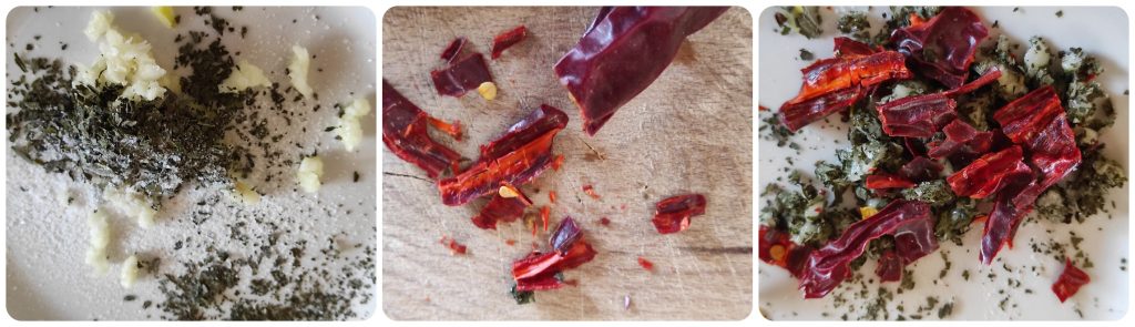 Schil de knoflook door de niet-eetbare delen te verwijderen en pers het in een knoflookpers. Snijd de chili in stukjes. Maak een oplossing van knoflook, basilicumpoeder, chili en zout.
