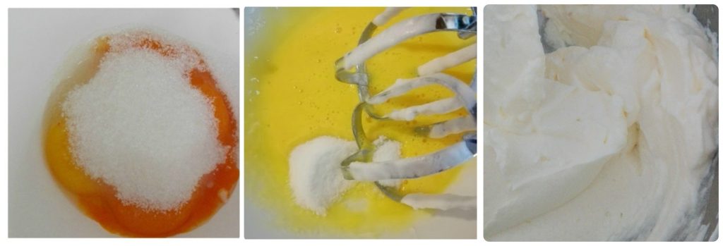 Klop nu in een andere kom de dooiers met de suiker tot een lichte en gladde massa, altijd op hoge snelheid.