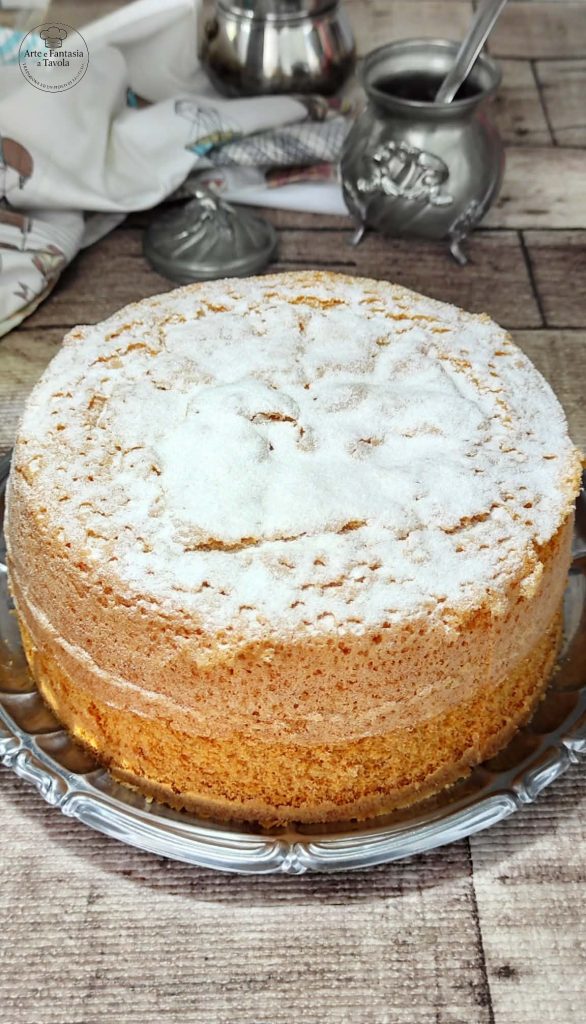 Laat de taart volledig afkoelen voordat je hem uit de vorm haalt: omdat hij heel fragiel en licht is, kan hij warm gemakkelijk breken. Als hij koud is, bestuif je royaal met poedersuiker.