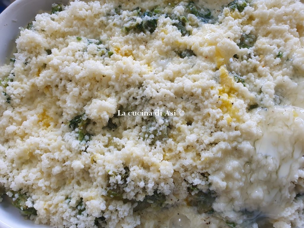 Ik klop het hele ei met de melk, zout, een beetje nootmuskaat en giet het over de zojuist gemaakte bereiding.