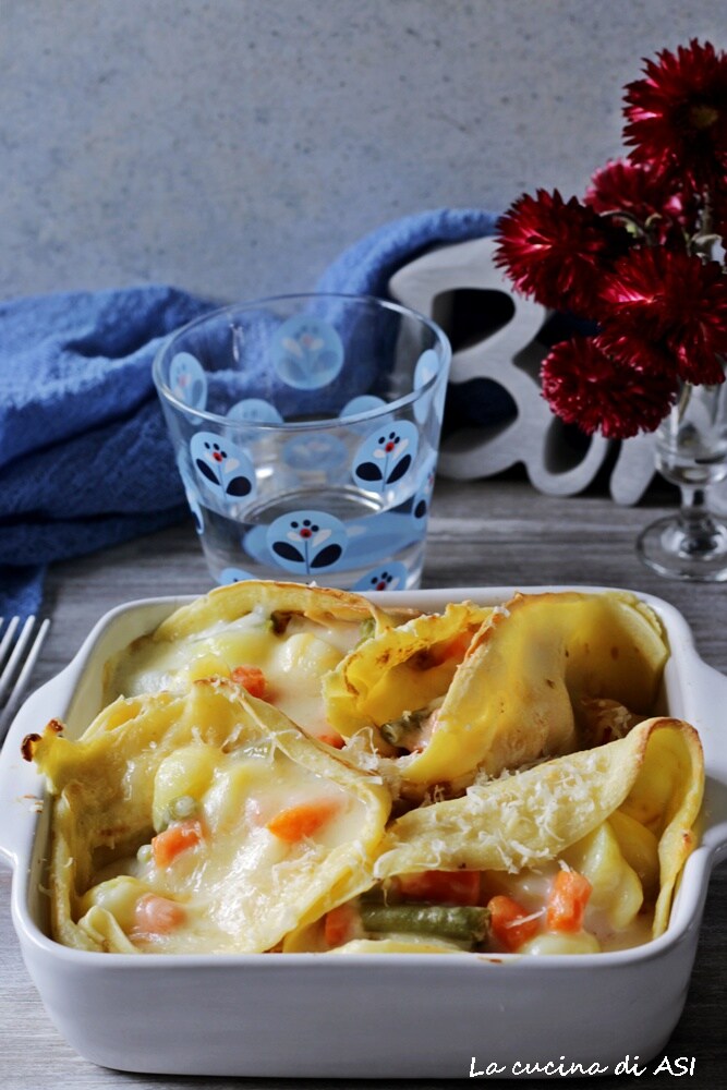 Perfect voor een zondag met het gezin of voor een speciale gelegenheid, deze crespelle zijn gevuld met gekookte en net gekruide groenten, verrijkt met een romige en vloeiende bechamelsaus,