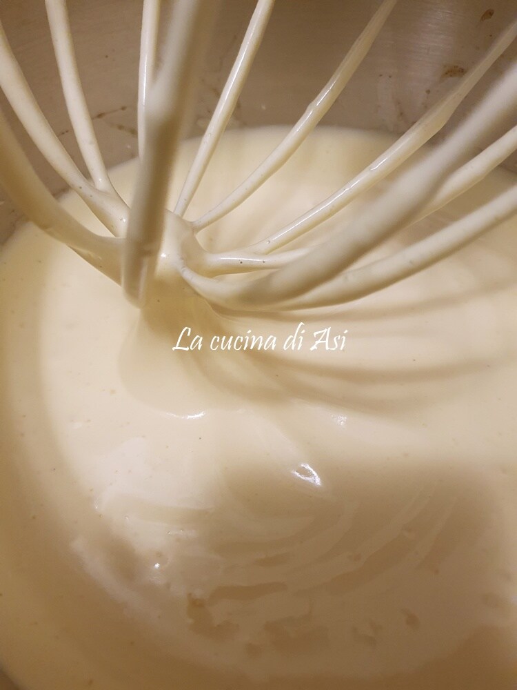 Blijf minstens 4/5 minuten kloppen: het mengsel wordt luchtig en als het van een lepel valt, zal het lintachtig zijn, of “schrijven” zoals ik als amateur zou zeggen.