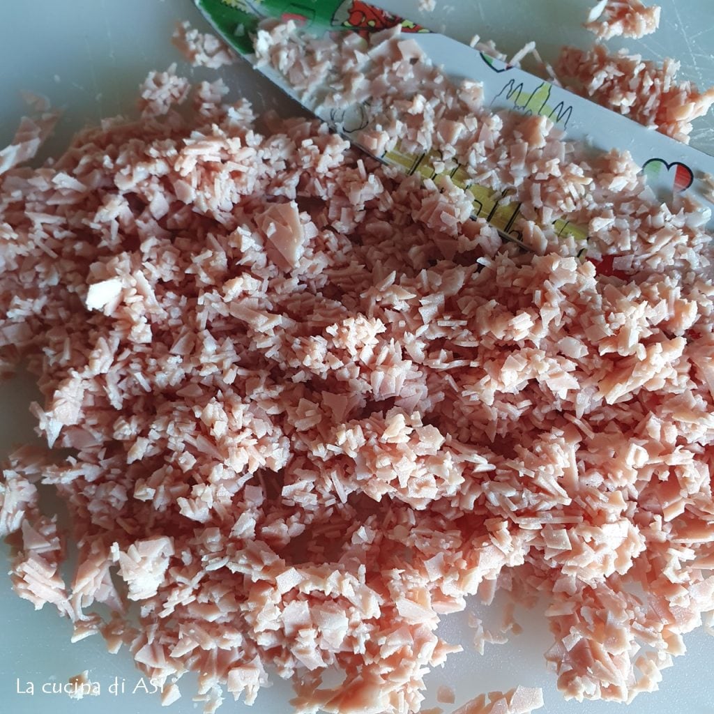 hak de mortadella zeer fijn en voeg het dan toe aan de gekookte en door de aardappelpers geperste aardappelen.