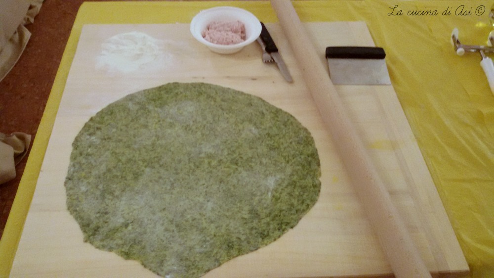 • Voor de pasta maak een kuiltje in de bloem en kneed met de spinazie, de eieren en de nootmuskaat.