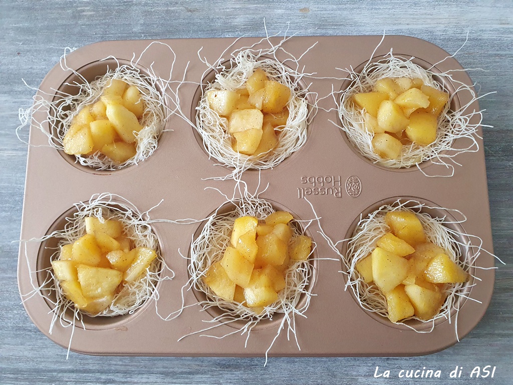 Zet de bakplaat met de met appels gevulde nestjes in een voorverwarmde oven op 170/180°C en bak ze ongeveer 15/18 minuten of tot de gebakjes goudbruin en krokant zijn.
