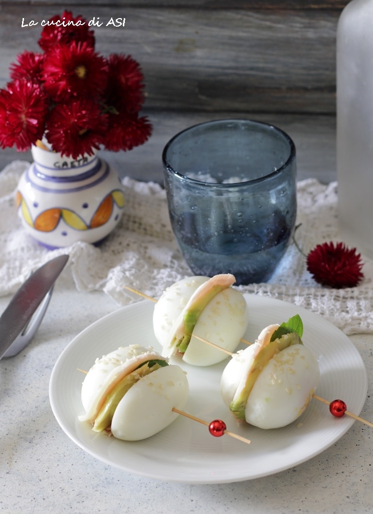 In dit recept worden de eieren van gemiddelde grootte als kleine broodjes gevuld met een frisse en smaakvolle vulling zoals gekookte ham, kaas zoals scamorza, provolone of mozzarella, avocado en een klein beetje lichte mayonaise.