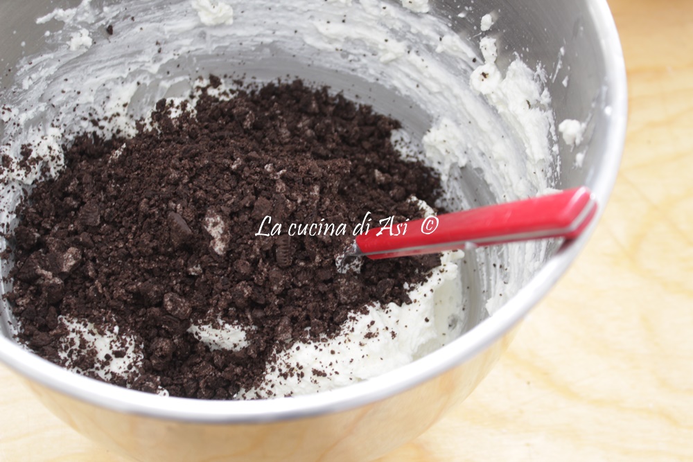 4)Meng goed en voeg dan ook de verkruimelde Oreo-koekjes toe.