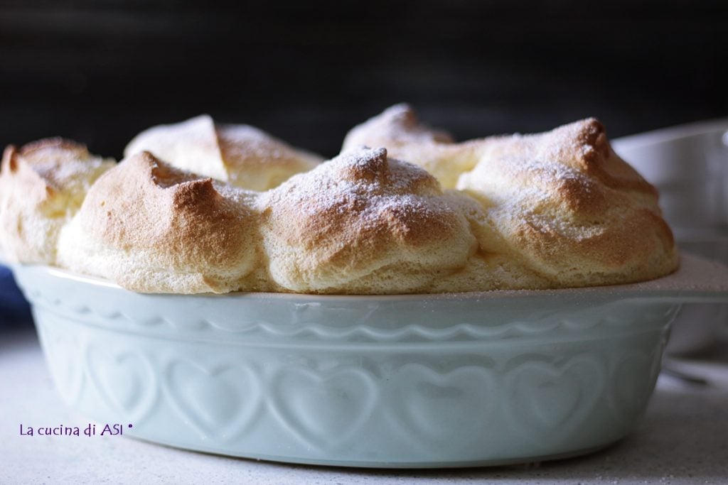 Ik heb de oven al voorverwarmd op 210°C en ik bak de Salzburgse soufflé met meringue door het op 180°C gedurende 10 minuten te bakken en vervolgens de oventemperatuur te verlagen naar 170°C, nog eens 8/9 minuten verder te bakken.