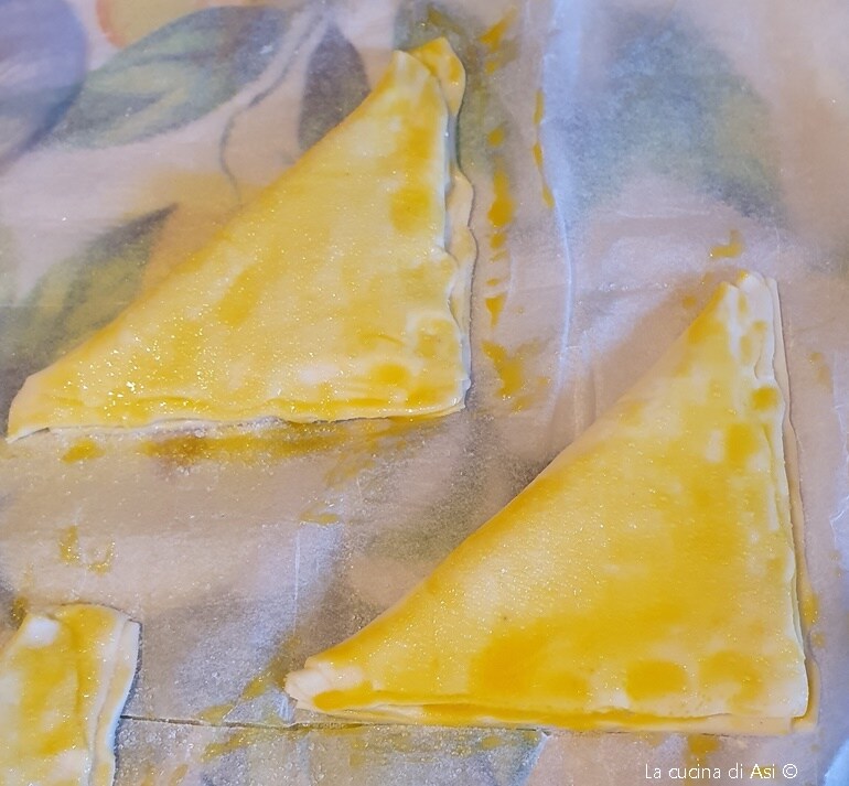 Bestrijk de bovenkant van de driehoeken met het resterende eidooier-melk mengsel. Leg de bladerdeeghapjes op de met nat en uitgewrongen bakpapier beklede bakplaat en bak ze in een voorverwarmde oven op 180°C gedurende ongeveer 15-20 minuten en haal ze uit de oven.