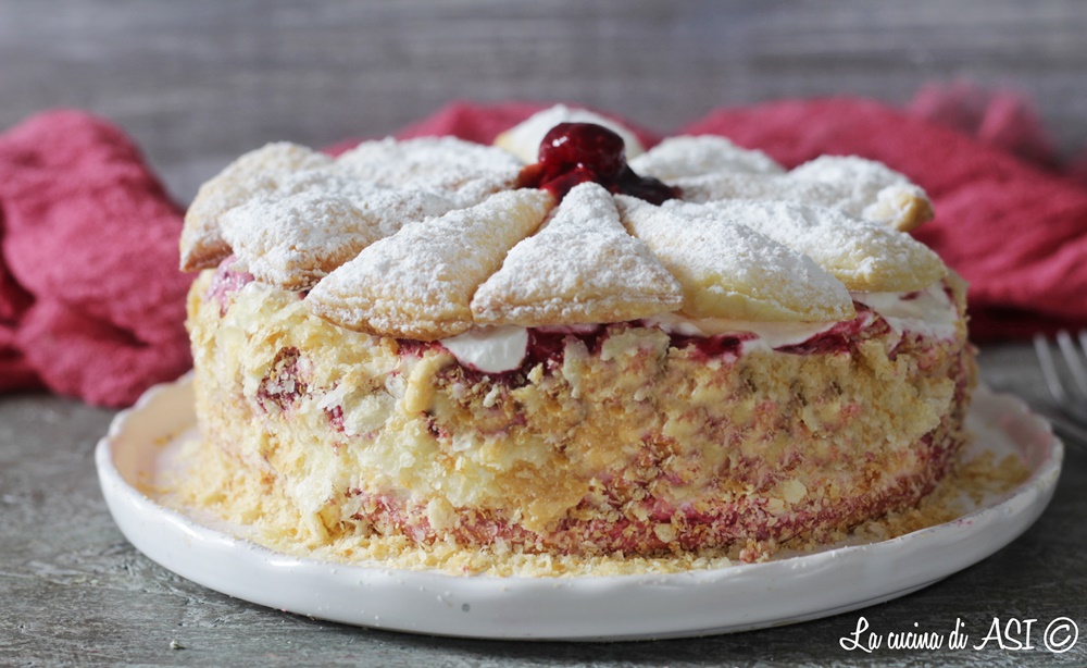 9) Ik zet het een paar uur in de koelkast en op het moment van proeven bestrooi ik de taart met bosvruchten in partjes met poedersuiker en na het verkruimelen van de bladerdeegrestjes bedek ik alle randen door de kruimels voorzichtig met de handpalm aan te drukken.