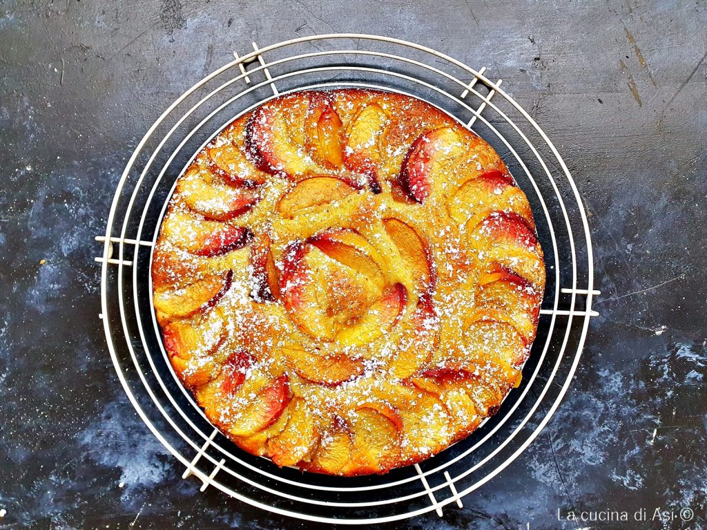 7) Na het bakken laat ik de taart afkoelen, haal hem uit de vorm en presenteer ik DE TAART MET VERSE EN INGEMAAKTE PERZIKEN met een ricotta-beslag ZONDER OLIE en ZONDER BOTER.