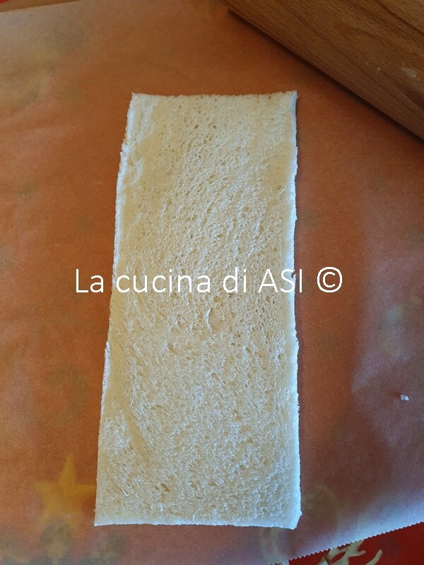 Ik rol het sandwichbrood uit door de plakken lichtjes met de deegroller te pletten om ze dunner en flexibeler te maken, klaar om opgerold te worden.