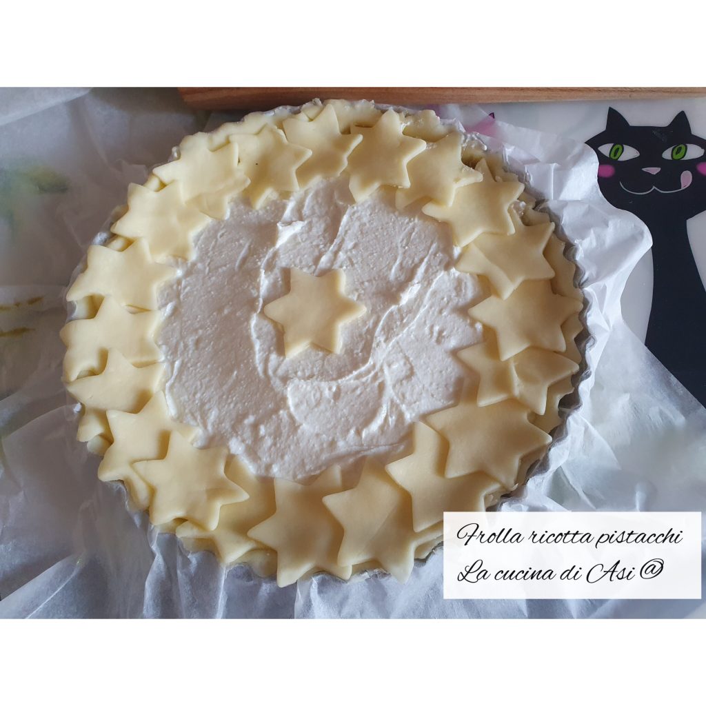 Met het resterende deeg en een koekvormpje snij ik bijvoorbeeld sterren uit waarmee ik de rand van de snelle ricotta en pistache taart versier en bedek.